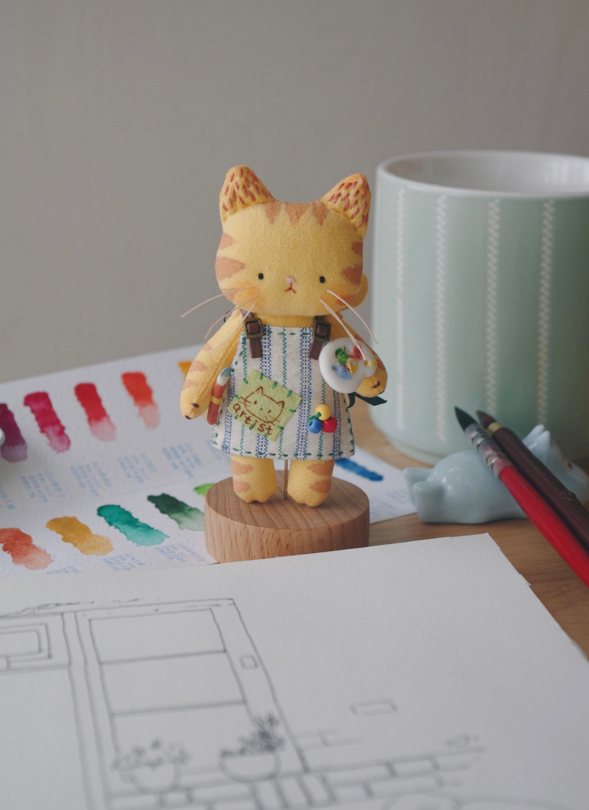 All tiny accessories (fish, bread, palettes, coffee cups) are fully handmade from resin clay and take 4–5 days to air-dry. Only 1–2 people on our team craft this design from start to finish. Current color options can be paired with different accessories — simply leave a note at checkout if you’d like, for example, yellow + violin.
