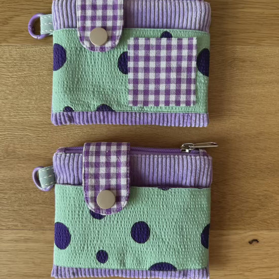 · Outer fabric: purple corduroy, front pocket in green with purple polka dots
