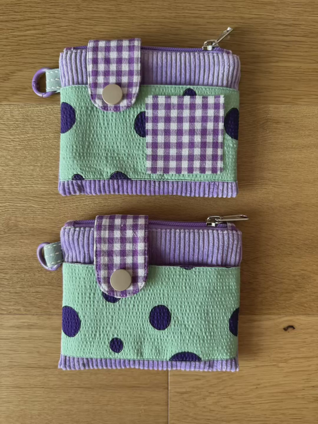 The design just got a thoughtful upgrade: on the outer right side, I sewed on a small patch of purple gingham fabric. To go with it, I found an enamel pin shaped like a purple capsule with a tiny cat. Fastened onto the patch, it matches beautifully with the pouch — a playful and charming detail that makes the piece feel personal.